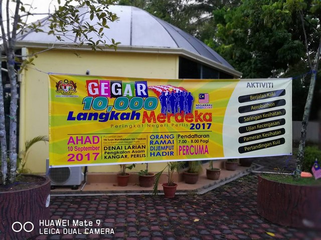 11 September 2017 | Aktiviti TerkiniPada 10 September 2017, telah berlangsung Program Gegar 10 Ribu Langkah Merdeka anjuran Jabatan Kesihatan Perlis. Program ini diadakan di Dataran Pengkalan Asam Kangar. Program ini berlangsung bermula jam 8.30 pagi sehingga 12.00 tengah hari.