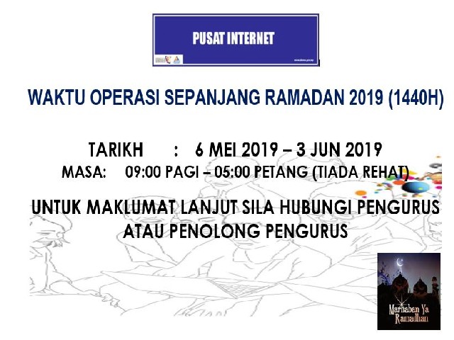 Berikut adalah Notis Waktu Operasi Pusat Internet Kg. Surau RPA pada bulan Ramadhan bermula 6 Mei - 3 Jun 2019